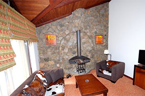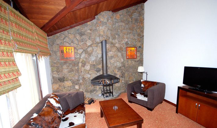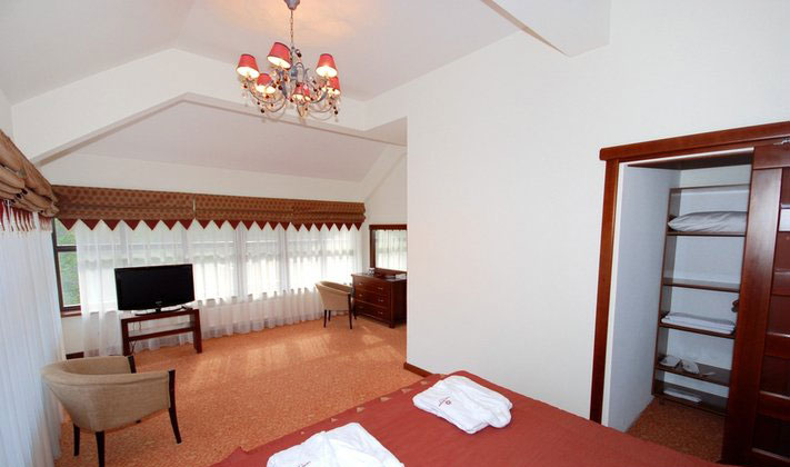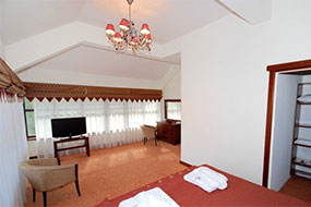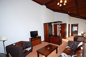 Двухкомнатный номер с большими витражными окнами и обзорной террасой. Площадь номера — 63 кв.м. Номер включает каминный зал с мягкой мебелью, оборудованный кухонных уголок, а также просторную спальную комнату.