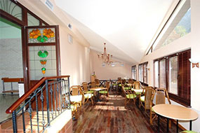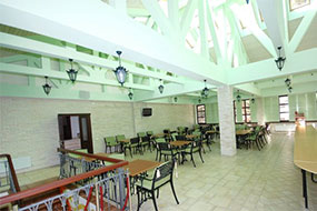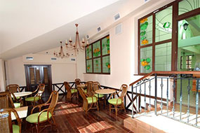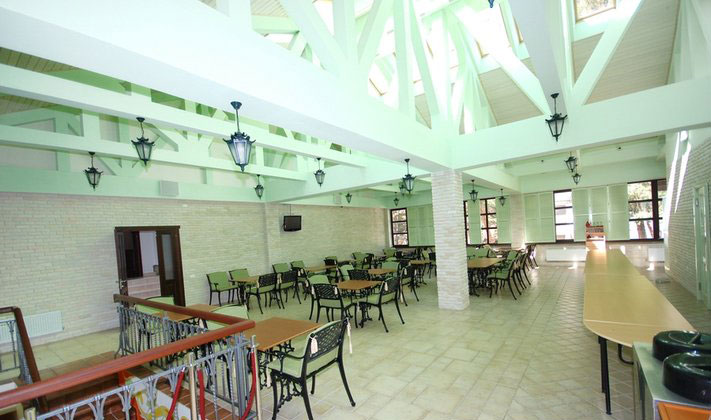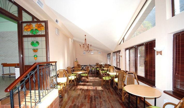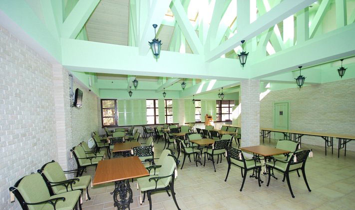 В отеле «Семь вершин» есть уютное кафе, где традиционно проходят завтраки и ужины. Регулярно в меню вводятся новые блюда и предлагаются сезонные тематические буфеты, в которых воплощаются наиболее интересные идеи кухонь разных стран мира. Кафе рассчитано на 60 человек.